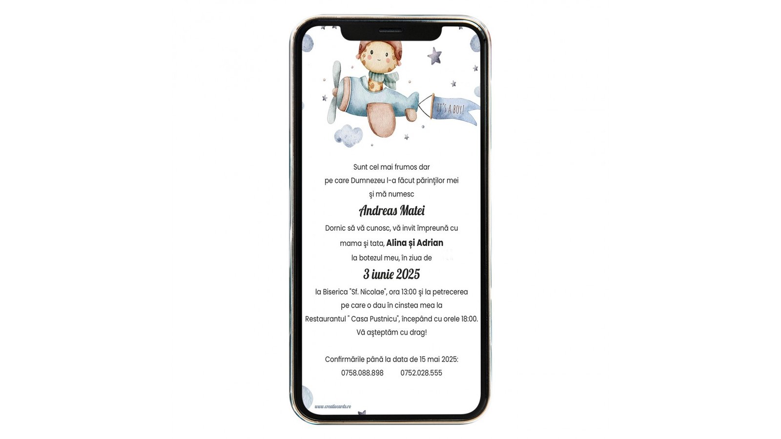 Ai un eveniment in viitorul apropiat! Vrei sa inviti oamenii rapid? [page_title], o varianta rapida si eficienta. Formatul invitatiei este JPEG, PNG sau PDF. Cum comand? Pentru a putea comanda trebuie sa urmati cativa pasi simpli: Completeaza formularul cu detaliile evenimentului, disponibil in pagina de produs. Plaseaza comanda In cat timp este gata comanda? Timpul mediu de realizare este cuprins intre 1-2 zile lucratoare. Ce se intampla dupa ce ati plasat comanda? Un coleg va reveni la dvs. cu un apel telefonic pentru confirmarea comenzii. Dupa confirmarea telefonica, veti primi pe whatssapp/mail macheta invitatiei pentru verificarea acesteia si utilizarea ei.