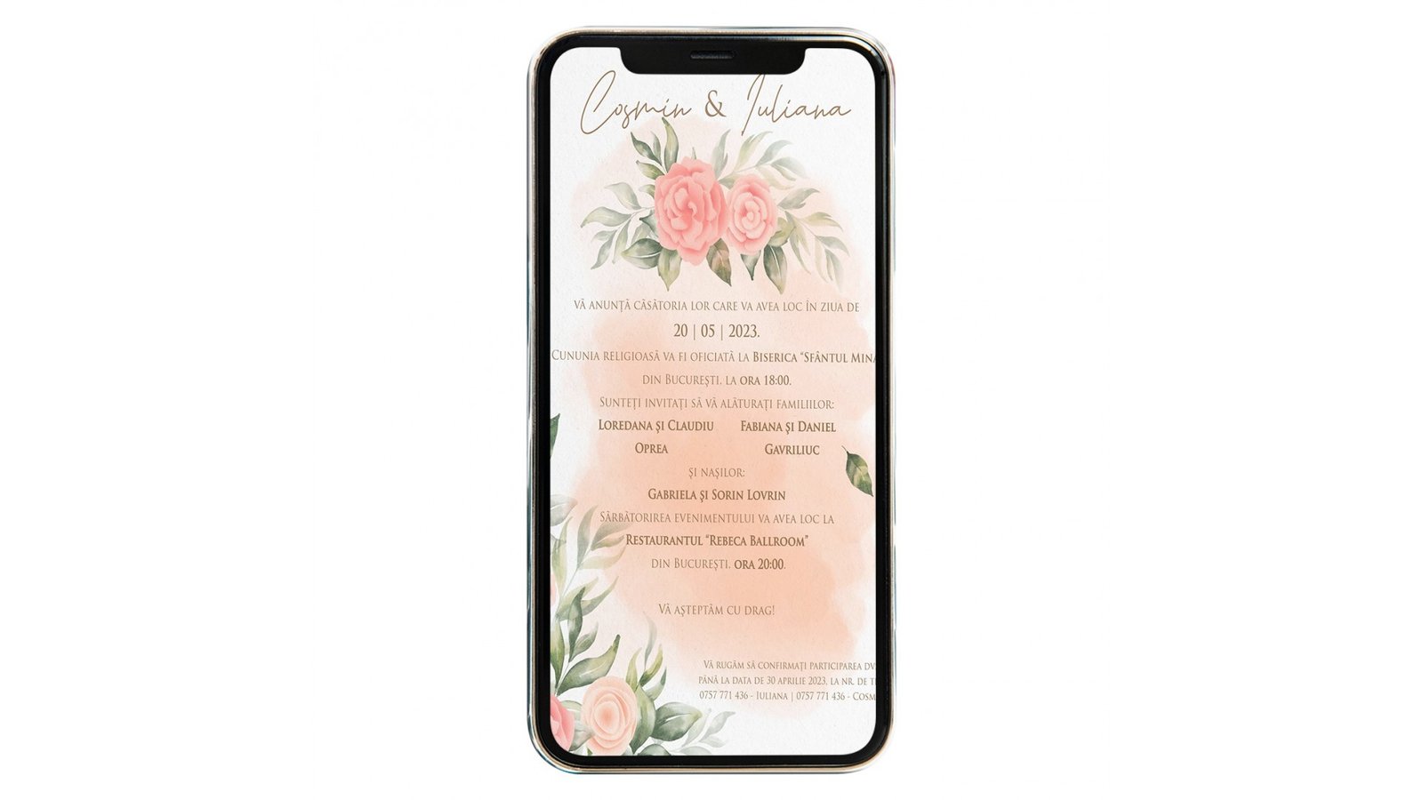 Ai un eveniment in viitorul apropiat! Vrei sa inviti oamenii rapid? [page_title], o varianta rapida si eficienta. Formatul invitatiei este JPEG, PNG sau PDF. Cum comand? Pentru a putea comanda trebuie sa urmati cativa pasi simpli: Completeaza formularul cu detaliile evenimentului, disponibil in pagina de produs. Plaseaza comanda In cat timp este gata comanda? Timpul mediu de realizare este cuprins intre 1-2 zile lucratoare. Ce se intampla dupa ce ati plasat comanda? Un coleg va reveni la dvs. cu un apel telefonic pentru confirmarea comenzii. Dupa confirmarea telefonica, veti primi pe whatssapp/mail macheta invitatiei pentru verificarea acesteia si utilizarea ei.