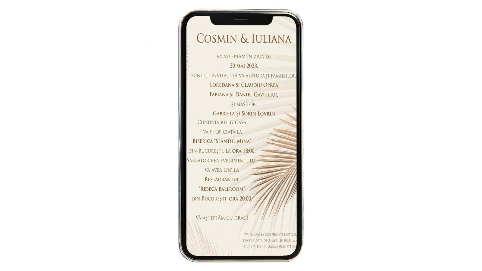 Ai un eveniment in viitorul apropiat! Vrei sa inviti oamenii rapid? [page_title], o varianta rapida si eficienta. Formatul invitatiei este JPEG, PNG sau PDF. Cum comand? Pentru a putea comanda trebuie sa urmati cativa pasi simpli: Completeaza formularul cu detaliile evenimentului, disponibil in pagina de produs. Plaseaza comanda In cat timp este gata comanda? Timpul mediu de realizare este cuprins intre 1-2 zile lucratoare. Ce se intampla dupa ce ati plasat comanda? Un coleg va reveni la dvs. cu un apel telefonic pentru confirmarea comenzii. Dupa confirmarea telefonica, veti primi pe whatssapp/mail macheta invitatiei pentru verificarea acesteia si utilizarea ei.