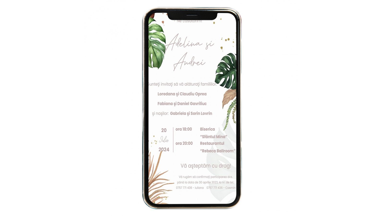 Ai un eveniment in viitorul apropiat! Vrei sa inviti oamenii rapid? [page_title], o varianta rapida si eficienta. Formatul invitatiei este JPEG, PNG sau PDF. Cum comand? Pentru a putea comanda trebuie sa urmati cativa pasi simpli: Completeaza formularul cu detaliile evenimentului, disponibil in pagina de produs. Plaseaza comanda In cat timp este gata comanda? Timpul mediu de realizare este cuprins intre 1-2 zile lucratoare. Ce se intampla dupa ce ati plasat comanda? Un coleg va reveni la dvs. cu un apel telefonic pentru confirmarea comenzii. Dupa confirmarea telefonica, veti primi pe whatssapp/mail macheta invitatiei pentru verificarea acesteia si utilizarea ei.