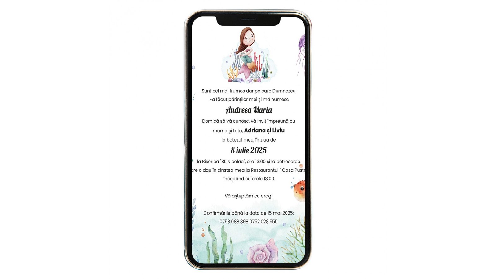 Ai un eveniment in viitorul apropiat! Vrei sa inviti oamenii rapid? [page_title], o varianta rapida si eficienta. Formatul invitatiei este JPEG, PNG sau PDF. Cum comand? Pentru a putea comanda trebuie sa urmati cativa pasi simpli: Completeaza formularul cu detaliile evenimentului, disponibil in pagina de produs. Plaseaza comanda In cat timp este gata comanda? Timpul mediu de realizare este cuprins intre 1-2 zile lucratoare. Ce se intampla dupa ce ati plasat comanda? Un coleg va reveni la dvs. cu un apel telefonic pentru confirmarea comenzii. Dupa confirmarea telefonica, veti primi pe whatssapp/mail macheta invitatiei pentru verificarea acesteia si utilizarea ei.