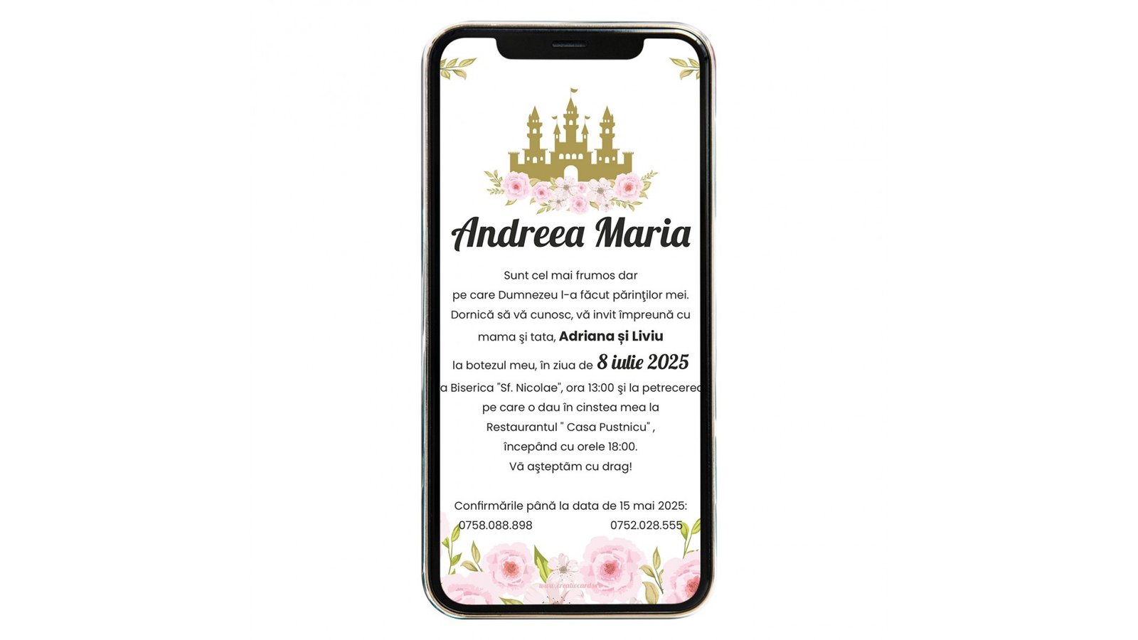 Ai un eveniment in viitorul apropiat! Vrei sa inviti oamenii rapid? [page_title], o varianta rapida si eficienta. Formatul invitatiei este JPEG, PNG sau PDF. Cum comand? Pentru a putea comanda trebuie sa urmati cativa pasi simpli: Completeaza formularul cu detaliile evenimentului, disponibil in pagina de produs. Plaseaza comanda In cat timp este gata comanda? Timpul mediu de realizare este cuprins intre 1-2 zile lucratoare. Ce se intampla dupa ce ati plasat comanda? Un coleg va reveni la dvs. cu un apel telefonic pentru confirmarea comenzii. Dupa confirmarea telefonica, veti primi pe whatssapp/mail macheta invitatiei pentru verificarea acesteia si utilizarea ei.