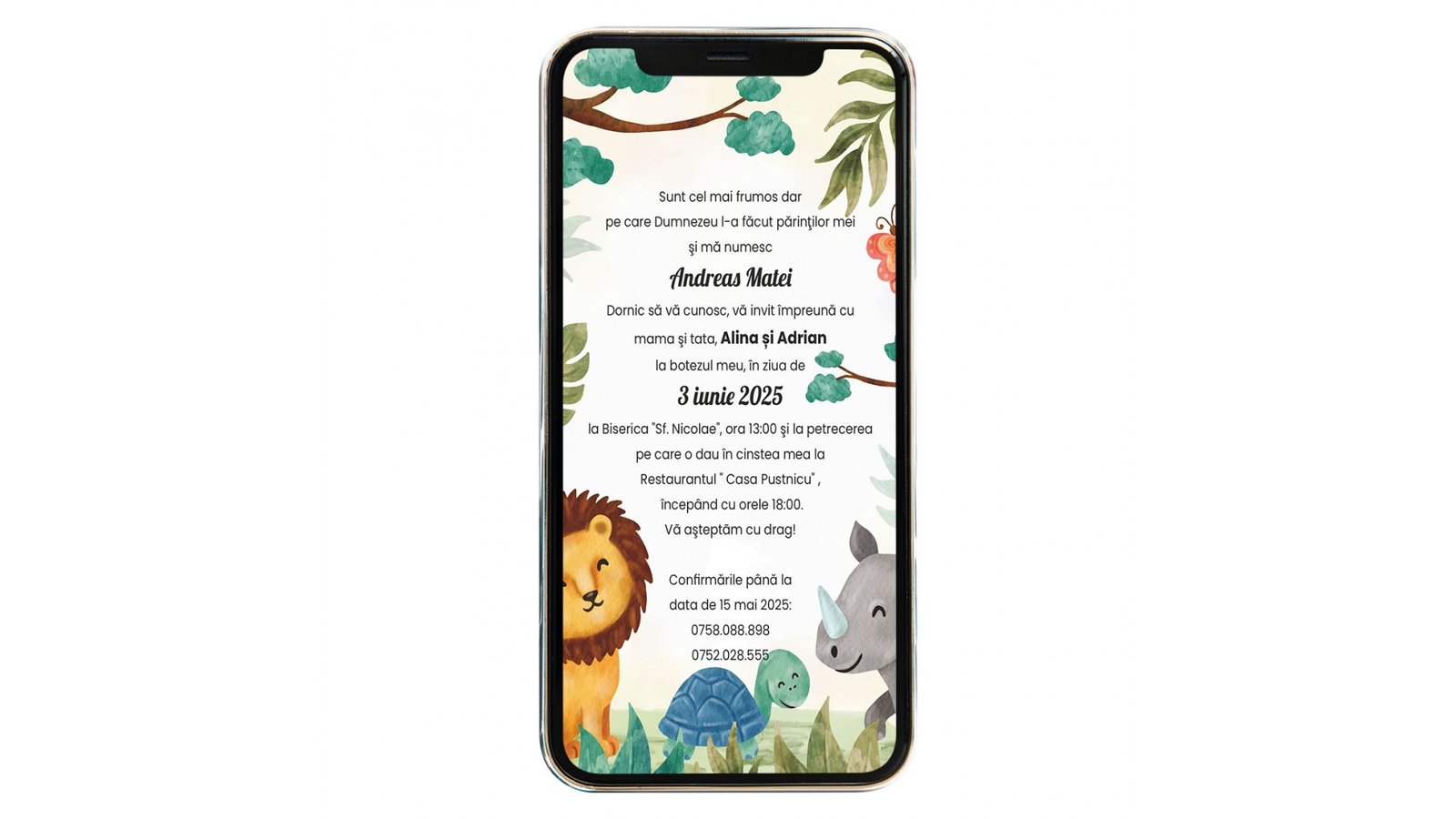 Ai un eveniment in viitorul apropiat! Vrei sa inviti oamenii rapid? [page_title], o varianta rapida si eficienta. Formatul invitatiei este JPEG, PNG sau PDF. Cum comand? Pentru a putea comanda trebuie sa urmati cativa pasi simpli: Completeaza formularul cu detaliile evenimentului, disponibil in pagina de produs. Plaseaza comanda In cat timp este gata comanda? Timpul mediu de realizare este cuprins intre 1-2 zile lucratoare. Ce se intampla dupa ce ati plasat comanda? Un coleg va reveni la dvs. cu un apel telefonic pentru confirmarea comenzii. Dupa confirmarea telefonica, veti primi pe whatssapp/mail macheta invitatiei pentru verificarea acesteia si utilizarea ei.