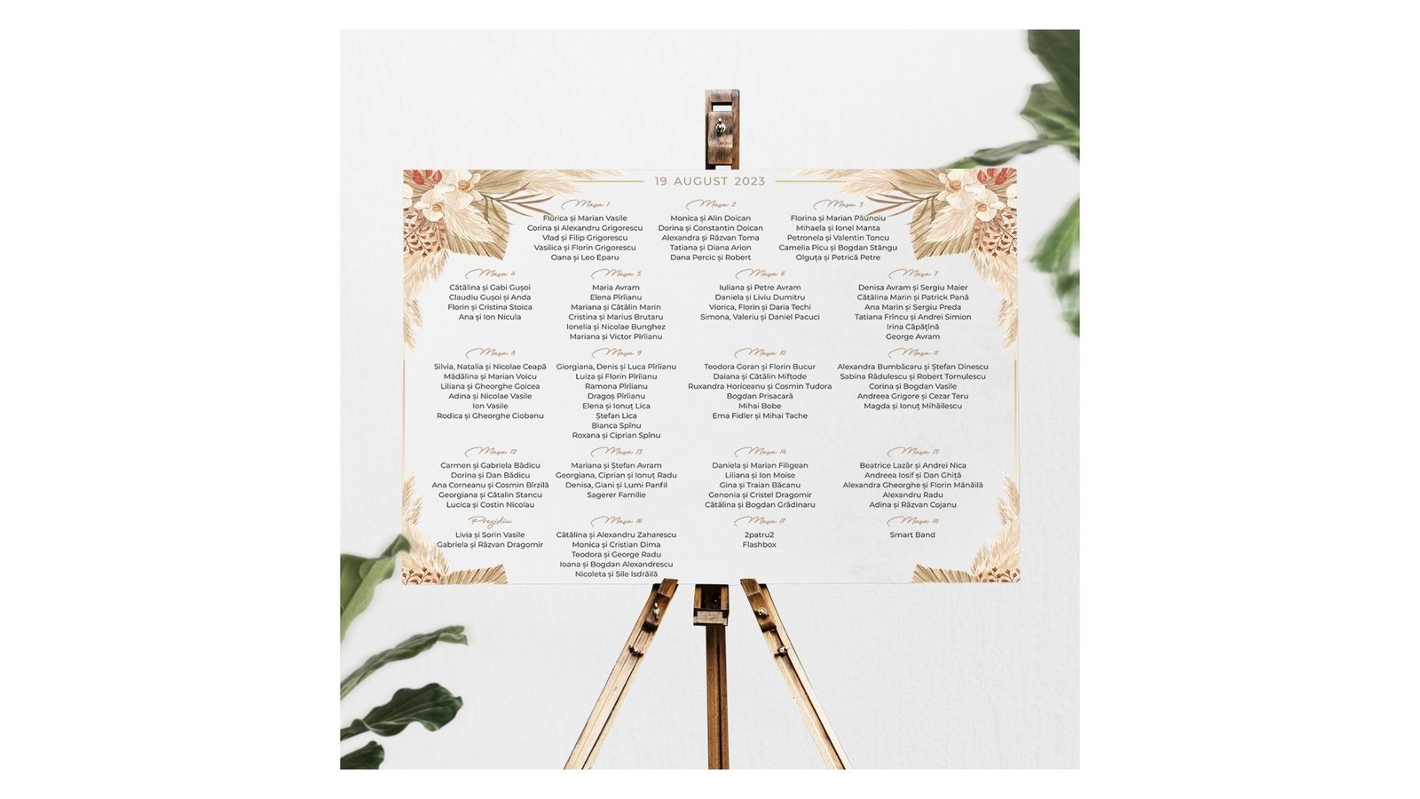 Succesul realizarii unui eveniment fara cusur consta in atentia la detalii, cum ar fi opisul sau asezarea la mese. De aceea va propunem, [page_title] produsul ideal pentru o mai buna organizare a evenimentului. Modelele concepute de noi sunt de cea mai inalta calitate, personalizate si lucrate cu mare atentie. Cum comand? Pentru a putea comanda trebuie sa urmati cativa pasi simpli: Alege dimensiunea si materialul Incarca fisierul cu asezarea la mese Plaseaza comanda Cum stiu ce material sa aleg? Opisul din carton/hartie de 200gr este potrivit pentru evenimentul unde la intrare este prezent un stativ de tip rama, deoarece acesta fiind foarte usor ca si greutate, nu poate sta fix si este si foarte fragil. Opisul din PVC este potrivit pentru stativul de tip sevalet, acesta fiind putin mai greu ca si greutate nu este la fel de fragil. In cat timp este gata comanda? Timpul mediu de realizare este cuprins intre 5-7 zile lucratoare. Ce se intampla dupa ce ati plasat comanda? Un coleg va reveni la dvs. cu un apel telefonic pentru confirmarea comenzii. Dupa confirmarea telefonica, veti primi pe whatssapp/mail macheta pentru verificarea acesteia. Doar dupa confirmarea dumneavoastra opisul se va tipari. Pentru text puteti alege orice culoare doriti, cu exceptia culorilor auriu si argintiu.