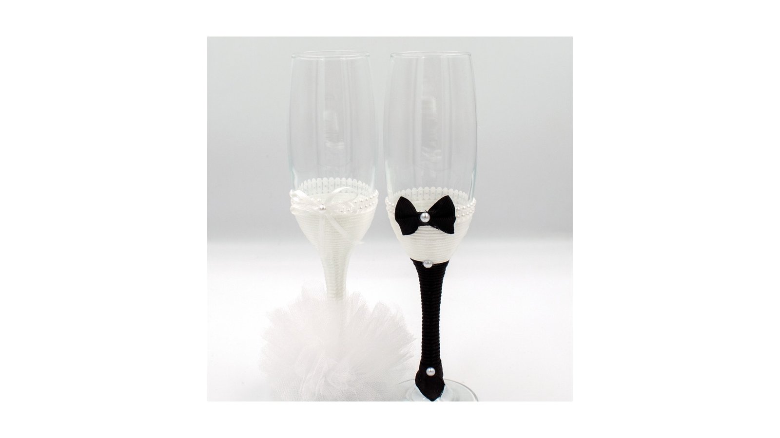 Pahare de sampanie pentru miri sau nași cu perle si tul