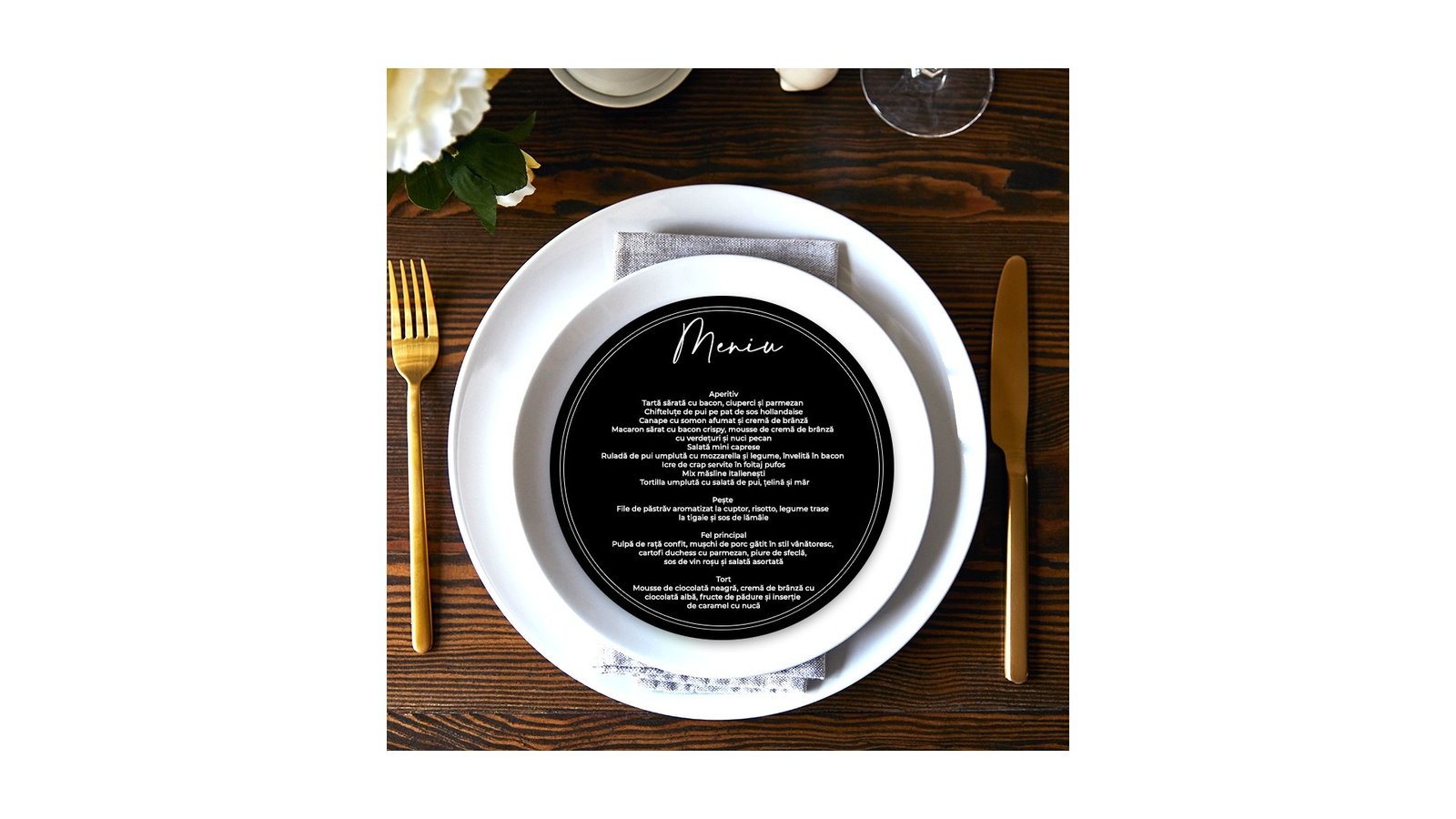Succesul realizarii unui eveniment fara cusur consta in atentia la detalii, cum ar fi meniurile. De aceea va propunem, [page_title] produsul ideal pentru un aranjament perfect al mesei. Modelele concepute de noi sunt de cea mai inalta calitate, personalizate si lucrate manual. Cum comand? Pentru a putea comanda trebuie sa urmati cativa pasi simpli: Alege varianta in care doresti sa achizitionezi meniurile: “Tiparite” sau “Tiparite si Asamblate”. Completeaza formularul cu detaliile evenimentului, disponibil in pagina de produs. Selecteaza cantitatea Plaseaza comanda Ce inseamna asamblare? Asamblarea consta in lipire, decupare, indoire, lipire accesorii, lipire funda, legare panglica etc. in functie de model. In cat timp este gata comanda? Timpul mediu de realizare este cuprins intre 5-7 zile lucratoare. Ce se intampla dupa ce ati plasat comanda? Un coleg va reveni la dvs. cu un apel telefonic pentru confirmarea comenzii. Dupa confirmarea telefonica, veti primi pe whatssapp/mail macheta meniului pentru verificarea acesteia. Doar dupa confirmarea dumneavoastra meniurile se vor tipari. Pentru text puteti alege orice culoare doriti, cu exceptia culorilor auriu si argintiu.