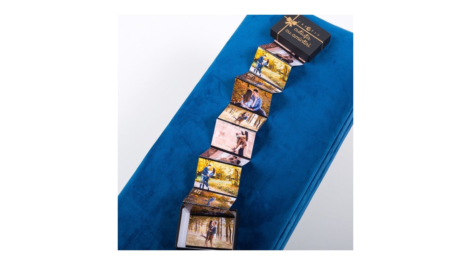 Cutiuta cu amintiri - cel mai apreciat cadou CREATIV! Cel mai frumos mod de a-i arăta persoanei de lângă tine cât de mult o iubești sunt amintirile acumulate împreună. Și cum se spune, "o fotografie face cât o mie de cuvinte", cutiuta cu amintiri poate fi cadoul ideal pentru acea persoana specială. Fotografiile sunt amintirile care trec testul timpului și care vor trezi întotdeauna un sentiment de nostalgie, chiar și în era tehnologiei, când majoritatea pozelor sunt digitalizate. Cutiuta cu amintiri cu 12 fotografii pliate este cea mai bună variantă – practic, ea este un album foto ambalat într-o cutie elegantă, neagră, care va găzdui cele mai frumoase amintiri. Ai nevoie de o cutiuta cu amintiri cu mai multe fotografii? Poti opta pentru celelalte produse similare: cutiuta cu amintiri cu 1