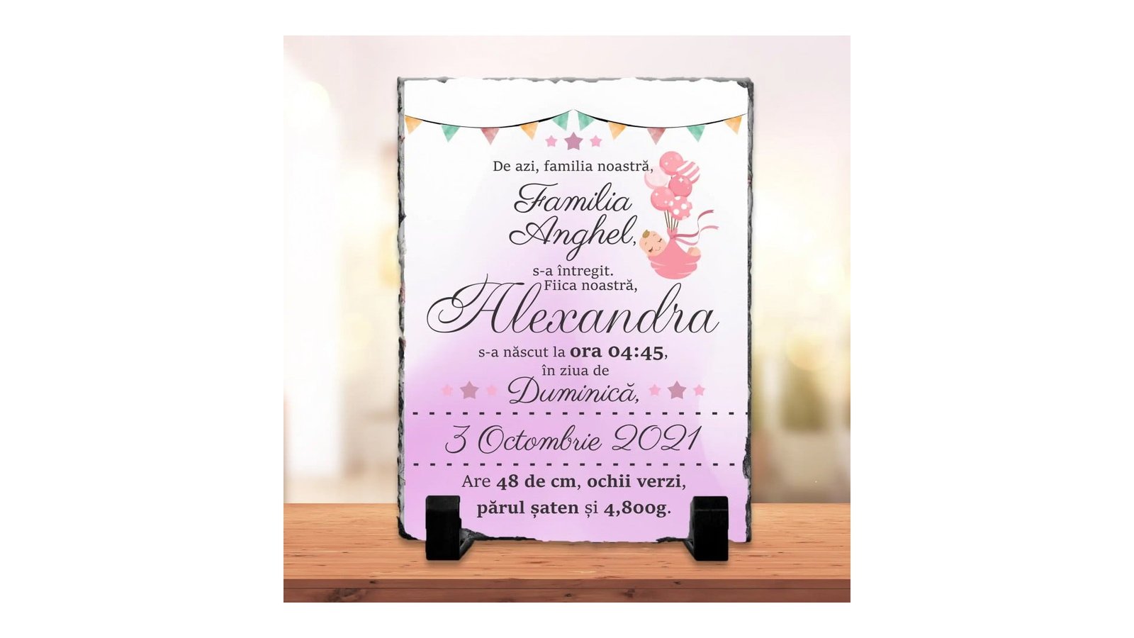 Sunteți în pană de idei și doriți să faceți un cadou special pentru o persoană dragă? post_title va fi întotdeauna o alegere bună! Fie că vorbim despre o fotografie imprimată sau un mesaj amuzant și personalizat, pietrele personalizate sunt utile in toate casele. Vă punem la dispoziție peste zeci de modele de perne personalizate , cu imagini proprii, texte amuzante, declarații de dragoste sau urări speciale pentru persoane cu activități importante. post_title este o modalitate excelentă pentru a vă putea asigura că amintirile dumneavoastră vor rezista pentru totdeauna. Este o idee de cadou personală și din suflet pentru o persoană dragă, dar este o achiziție minunată chiar și pentru locuința dumneavoastră. Specificații: Suportul pentru susținerea plăcii este inclus. Tot ce trebuie să faceți este să încărcați fotografia dumneavoastră în format JPEG sau PNG. Vă informam că lățimea maximă, precum și înălțimea maximă a fotografiei este de 2000 px. Alegeți o fotografie cât mai clară și calitativă pentru a beneficia de cea mai bună imprimare posibilă. Dimensiunile placă mică: 14 x 19 x 1,2 cm. Dimensiune placă mare: 20 x 30 x 1,2 cm (A4). post_title se poate comanda foarte rapid in doar 4 pasi: Pasul 1: Apasa butonul de personalizare pentru ati completa datele sau pentru a crea modelul tau Pasul 2: Adauga in cos Pasul 3: Plaseaza comanda Pasul 4: Bucură-te de o piatra personalizata exact pe gustul tau.