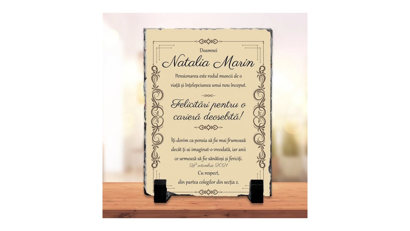 Sunteți în pană de idei și doriți să faceți un cadou special pentru o persoană dragă? post_title va fi întotdeauna o alegere bună! Fie că vorbim despre o fotografie imprimată sau un mesaj amuzant și personalizat, pietrele personalizate sunt utile in toate casele. Vă punem la dispoziție peste zeci de modele de perne personalizate , cu imagini proprii, texte amuzante, declarații de dragoste sau urări speciale pentru persoane cu activități importante. post_title este o modalitate excelentă pentru a vă putea asigura că amintirile dumneavoastră vor rezista pentru totdeauna. Este o idee de cadou personală și din suflet pentru o persoană dragă, dar este o achiziție minunată chiar și pentru locuința dumneavoastră. Specificații: Suportul pentru susținerea plăcii este inclus. Tot ce trebuie să faceți este să încărcați fotografia dumneavoastră în format JPEG sau PNG. Vă informam că lățimea maximă, precum și înălțimea maximă a fotografiei este de 2000 px. Alegeți o fotografie cât mai clară și calitativă pentru a beneficia de cea mai bună imprimare posibilă. Dimensiunile placă mică: 14 x 19 x 1,2 cm. Dimensiune placă mare: 20 x 30 x 1,2 cm (A4). post_title se poate comanda foarte rapid in doar 4 pasi: Pasul 1: Apasa butonul de personalizare pentru ati completa datele sau pentru a crea modelul tau Pasul 2: Adauga in cos Pasul 3: Plaseaza comanda Pasul 4: Bucură-te de o piatra personalizata exact pe gustul tau.