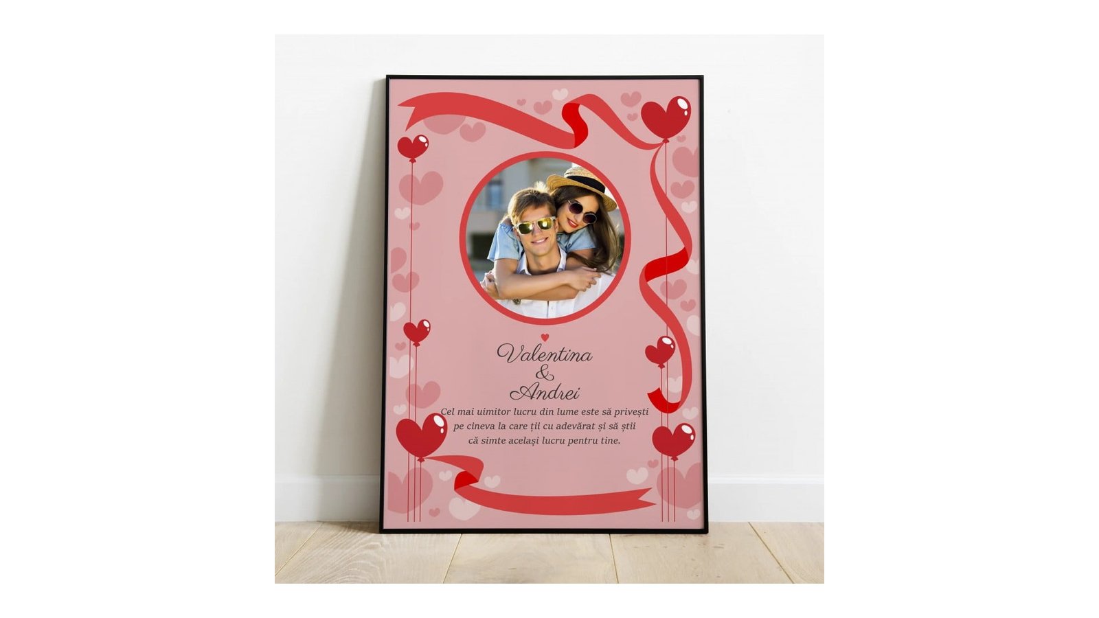 Cele mai frumoase amintiri rămân cele înrămate, nu-i așa? Vreți să surprindeți o persoană specială cu un cadou deosebit, personal și pe care să îl poată păstra ani de zile? Deși trăim în era tehnologiei, tablourile personalizate au rămas unele dintre cele mai apreciate cadouri de către cei dragi. Indiferent de ocazie – zi de naștere, Crăciun, aniversarea relației și altele, un tablou personalizat pentru cupluri va trece testul timpului si va fi la fel de apreciat. Avand o categorie special dedicata tablourilor personalizate , inevitabil vei gasi ceva pe placul tau. Specificații: Alegeți o fotografie calitativă, în format JPEG sau PNG și încărcați-o pe site. Calitatea tabloului este influențată de calitatea fotografiei încărcate. Rama este confecționată din plastic cu sticla, iar fotografia este printata inkjet. Pentru a putea comanda tablou personalizat pentru cupluri trebuie să urmați câțiva pași simpli: Pasul 1: Alege dimensiunea tabloului. Pasul 2: Personalizeaza tabloul. Pasul 3: Adauga in cos si plaseaza comanda. Pasul 4: Bucură-te alături de cei dragi de tabloul comandat.