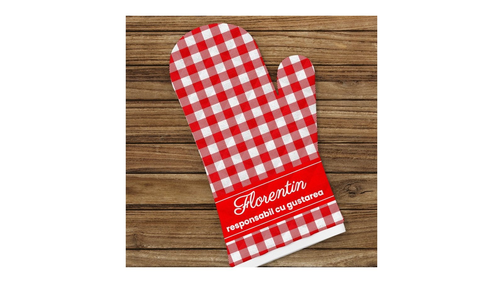 Petreceți mult timp în bucătărie? Sunteți pasionat de arta gastronomiei? Sau poate aveți persoane dragi pentru care gătitul este cea mai plăcută activitate? Atunci o manusa de bucatarie personalizata - gustare este cea mai bună idee de cadou! Indiferent dacă vorbim de un model personalizat sau un mesaj amuzant sugerat de noi, mănușile de bucătărie personalizate sunt o metodă excelentă de a transmite cuiva un mesaj de a petrece mai mult timp la cratiță. Disponibile cu mesaje amuzante sau personalizate cu numele ales de dumneavoastră, mănușile personalizate CREATIV sunt confecționate dintr-un material de calitate și vor fi o plăcere de purtat în timpul gătitului. Alaturi de manusa puteti comanda si o boneta , un tocator sau chiar un sort . Specificatii: Manusa pentru mana dreapta Dimensiune: 17 x 27 cm Material: 100% poilester Pentru a putea comanda o manusa de bucatarie personalizata - gustare trebuie să urmați câțiva pași: Pasul 1: Apasa butonul de personalizare pentru ati completa datele sau pentru a crea modelul tau Pasul 2: Adauga in cos Pasul 3: Plaseaza comanda Pasul 4: Bucură-te de o manusa personalizata exact pe gustul tau.