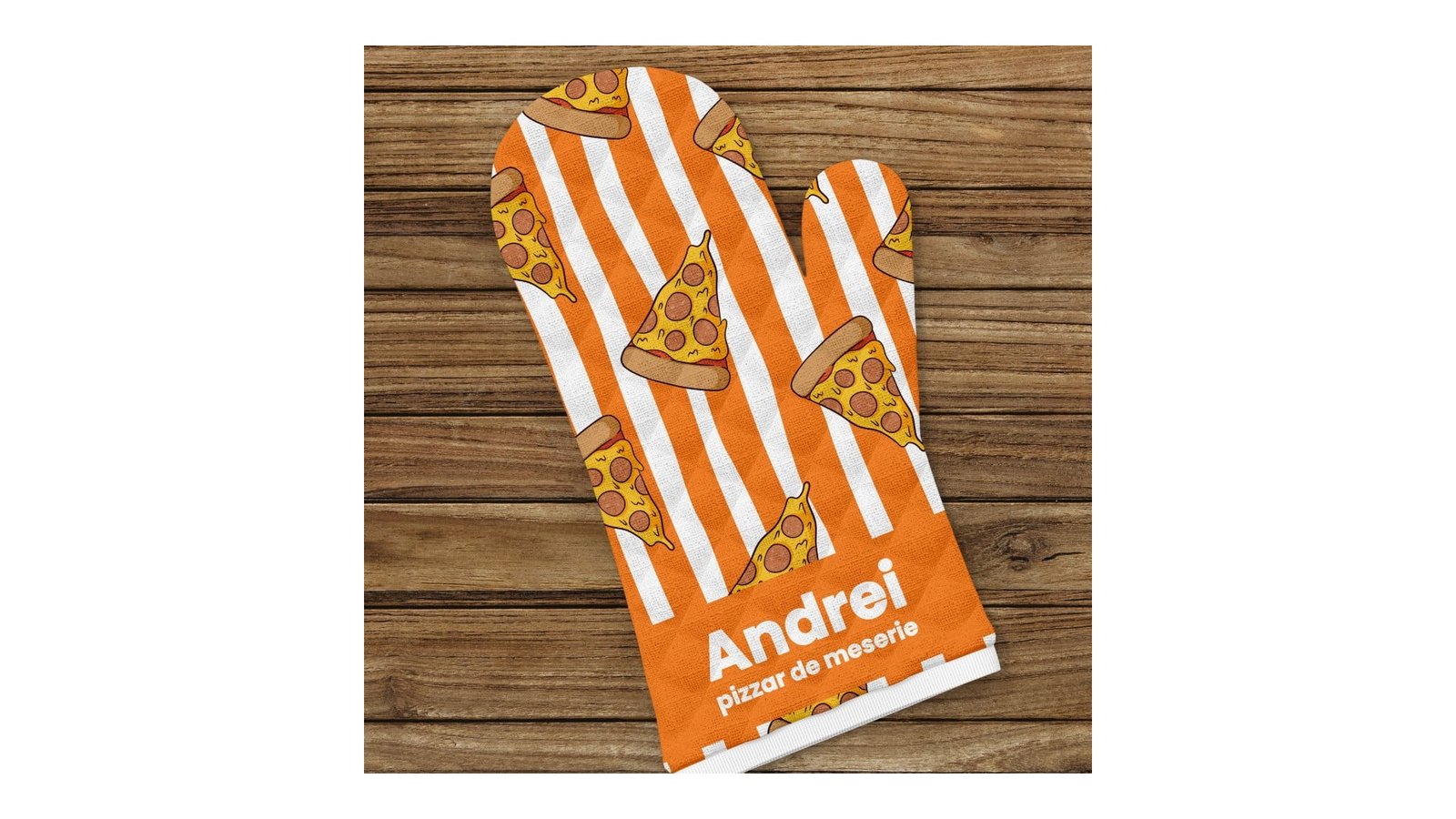 Petreceți mult timp în bucătărie? Sunteți pasionat de arta gastronomiei? Sau poate aveți persoane dragi pentru care gătitul este cea mai plăcută activitate? Atunci o manusa de bucatarie personalizata - pizza este cea mai bună idee de cadou! Indiferent dacă vorbim de un model personalizat sau un mesaj amuzant sugerat de noi, mănușile de bucătărie personalizate sunt o metodă excelentă de a transmite cuiva un mesaj de a petrece mai mult timp la cratiță. Disponibile cu mesaje amuzante sau personalizate cu numele ales de dumneavoastră, mănușile personalizate CREATIV sunt confecționate dintr-un material de calitate și vor fi o plăcere de purtat în timpul gătitului. Alaturi de manusa puteti comanda si o boneta , un tocator sau chiar un sort . Specificatii: Manusa pentru mana dreapta Dimensiune: 1