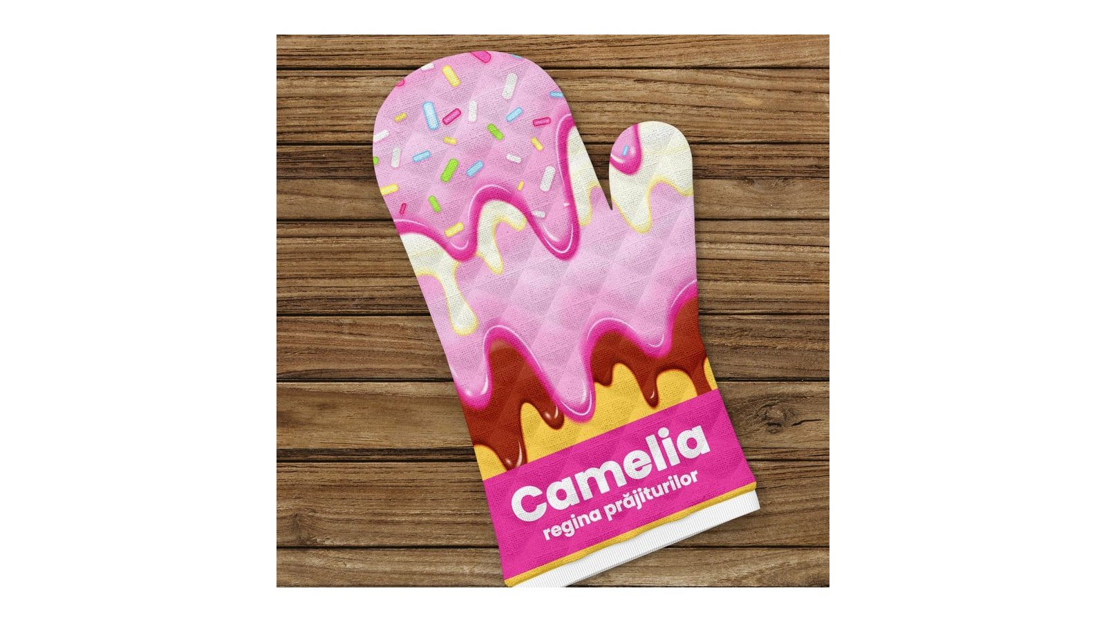 Petreceți mult timp în bucătărie? Sunteți pasionat de arta gastronomiei? Sau poate aveți persoane dragi pentru care gătitul este cea mai plăcută activitate? Atunci o manusa de bucatarie personalizata - delicios este cea mai bună idee de cadou! Indiferent dacă vorbim de un model personalizat sau un mesaj amuzant sugerat de noi, mănușile de bucătărie personalizate sunt o metodă excelentă de a transmite cuiva un mesaj de a petrece mai mult timp la cratiță. Disponibile cu mesaje amuzante sau personalizate cu numele ales de dumneavoastră, mănușile personalizate CREATIV sunt confecționate dintr-un material de calitate și vor fi o plăcere de purtat în timpul gătitului. Alaturi de manusa puteti comanda si o boneta , un tocator sau chiar un sort . Specificatii: Manusa pentru mana dreapta Dimensiune: 17 x 27 cm Material: 100% poilester Pentru a putea comanda o manusa de bucatarie personalizata - delicios trebuie să urmați câțiva pași: Pasul 1: Apasa butonul de personalizare pentru ati completa datele sau pentru a crea modelul tau Pasul 2: Adauga in cos Pasul 3: Plaseaza comanda Pasul 4: Bucură-te de o manusa personalizata exact pe gustul tau.
