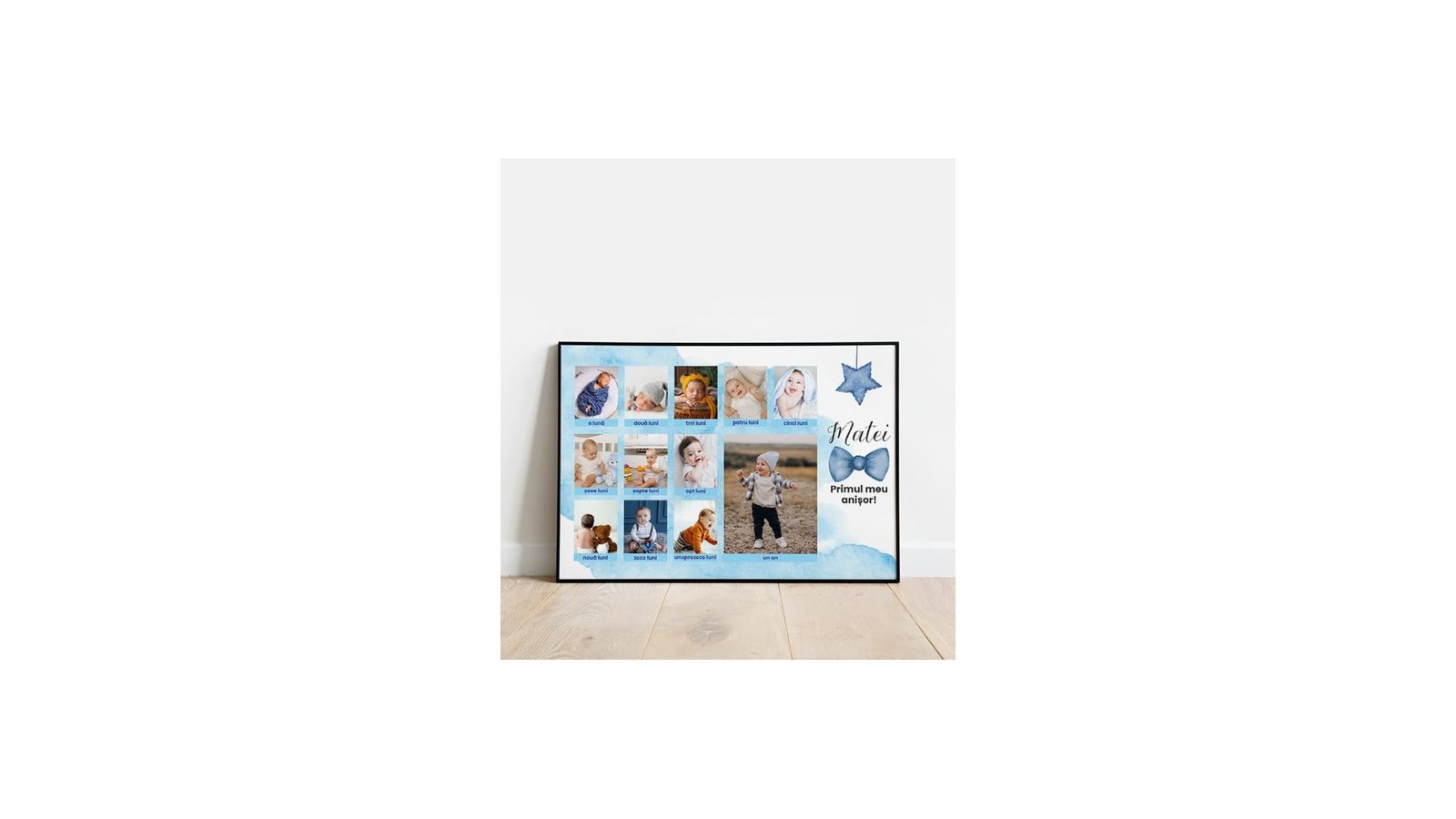 Cele mai frumoase amintiri rămân cele înrămate, nu-i așa? Vreți să surprindeți o persoană specială cu un cadou deosebit, personal și pe care să îl poată păstra ani de zile? Deși trăim în era tehnologiei, tablourile personalizate au rămas unele dintre cele mai apreciate cadouri de către cei dragi. Indiferent de ocazie – zi de naștere, Crăciun, aniversarea relației și altele, un tablou personalizat Primul anisor - baietel va trece testul timpului si va fi la fel de apreciat. Avand o categorie special dedicata tablourilor personalizate , inevitabil vei gasi ceva pe placul tau. Specificații: Alegeți o fotografie calitativă, în format JPEG sau PNG și încărcați-o pe site. Calitatea tabloului este influențată de calitatea fotografiei încărcate. Rama este confecționată din plastic cu sticla, iar f