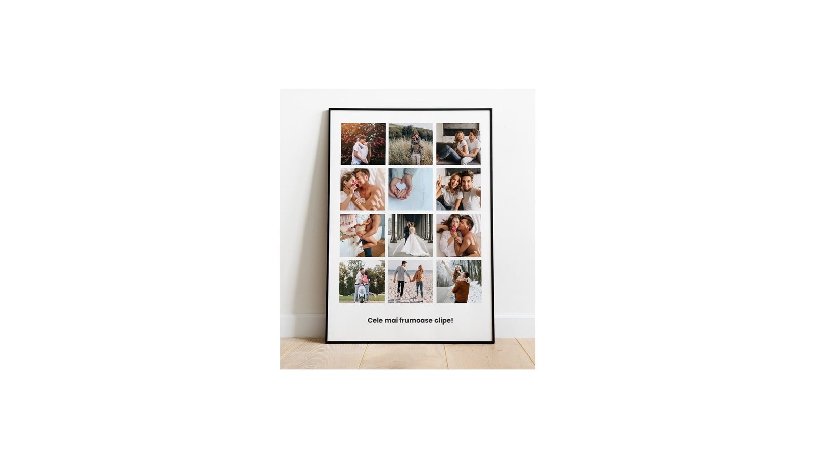 Cele mai frumoase amintiri rămân cele înrămate, nu-i așa? Vreți să surprindeți o persoană specială cu un cadou deosebit, personal și pe care să îl poată păstra ani de zile? Deși trăim în era tehnologiei, tablourile personalizate au rămas unele dintre cele mai apreciate cadouri de către cei dragi. Indiferent de ocazie – zi de naștere, Crăciun, aniversarea relației și altele, un tablou personalizat cu 12 fotografii si mesaj va trece testul timpului si va fi la fel de apreciat. Avand o categorie special dedicata tablourilor personalizate , inevitabil vei gasi ceva pe placul tau. Specificații: Alegeți o fotografie calitativă, în format JPEG sau PNG și încărcați-o pe site. Calitatea tabloului este influențată de calitatea fotografiei încărcate. Rama este confecționată din plastic cu sticla, iar fotografia este printata inkjet. Pentru a putea comanda tablou personalizat cu 12 fotografii si mesaj trebuie să urmați câțiva pași simpli: Pasul 1: Alege dimensiunea tabloului. Pasul 2: Personalizeaza tabloul. Pasul 3: Adauga in cos si plaseaza comanda. Pasul 4: Bucură-te alături de cei dragi de tabloul comandat.