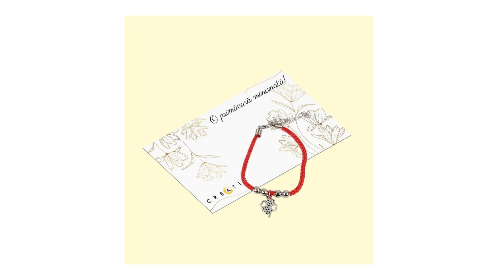 Primăvara aceasta împarte bucuria cu ajutorul mărțișoarelor CREATIV. post_title va aduce celor dragi ție un motiv în plus să zâmbească primăvara aceasta. post_title este alegerea potrivită pentru a sarbatorii Primavara. Disponibile cu mesaje amuzante sau personalizate cu numele ales de dumneavoastră, felicitarile CREATIV sunt confecționate dintr-un material de calitate.. Verifica gama noastra completa de martisoare personalizate pentru a alege ceva potrivit persoanei. Specificatii: Marțișor personalizat cu mesajul dumneavoastră și o brățară Mărțișor împletită, cu grosime de 2 mm. Acestea au atașat un charm trifoi, trifoi mic, potcoava sau copac. Lungime totală brățară: 18cm+5cm. Dimensiune aproximativă charm 18x13mm. Suportul este dintr-un carton calitativ de 350 gr. Dimensiunea suportului
