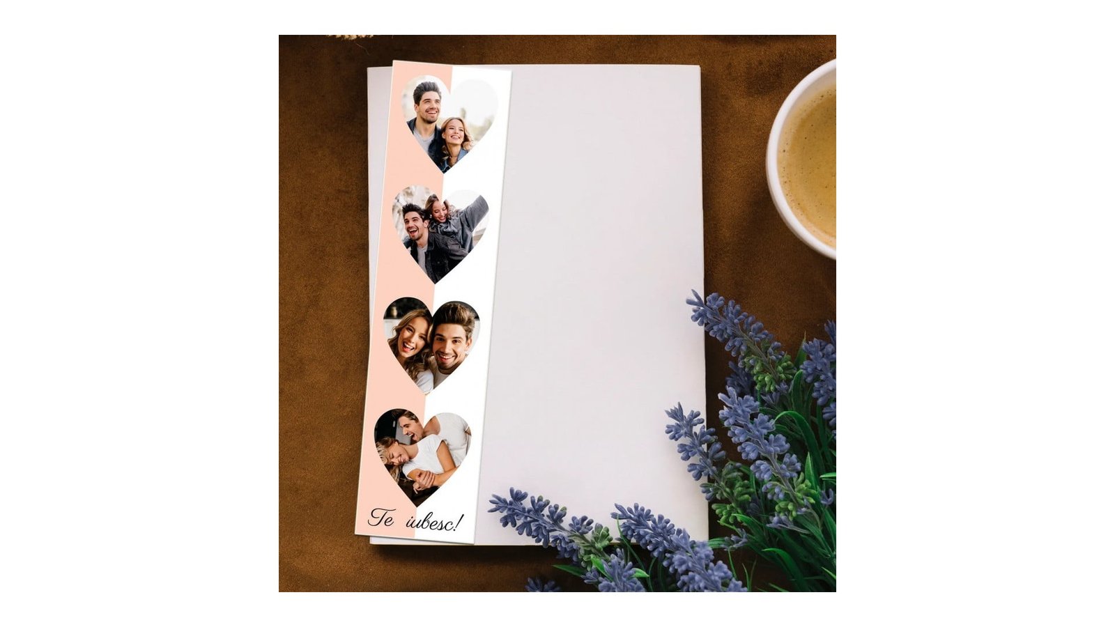 Sunteti pasionat de citit? Aveti o cunostinta ce este mare amatoare de literatura? Un semn de carte personalizat cu 4 fotografii inima si text este alegerea potrivită pentru o astfel de persoana. Personalizate cu fotografii, mesaje sau citate, semnele noastre de carte sunt confecționate dintr-un material de calitate. Verifica gama noastra completa de semne personalizate pentru a alege ceva potrivit. Specificatii: Material: carton 300gr semiglossy Dimensiune: 20 x 5 cm Pentru a putea comanda un semn de carte personalizat cu 4 fotografii inima si text trebuie să urmați câțiva pași: Pasul 1: Apasa butonul de personalizare pentru ati completa datele sau pentru a crea modelul tau Pasul 2: Adauga in cos Pasul 3: Plaseaza comanda Pasul 4: Bucură-te de un semn de carte personalizat exact pe gustul tau.