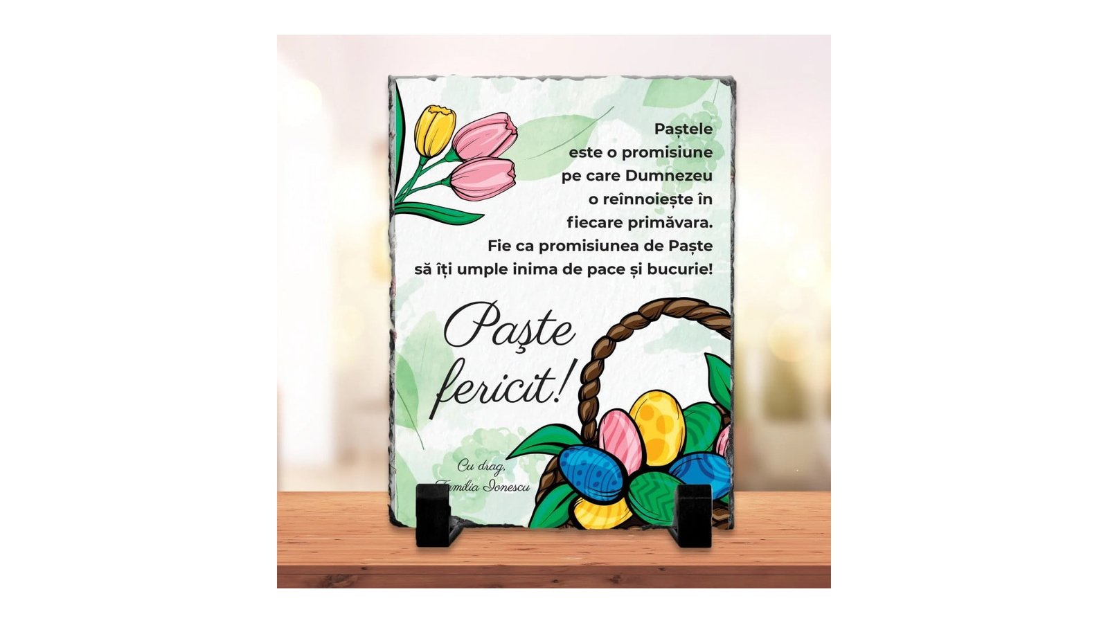 Sunteți în pană de idei și doriți să faceți un cadou special pentru o persoană dragă? post_title va fi întotdeauna o alegere bună! Fie că vorbim despre o fotografie imprimată sau un mesaj amuzant și personalizat, pietrele personalizate sunt utile in toate casele. Vă punem la dispoziție peste zeci de modele de perne personalizate , cu imagini proprii, texte amuzante, declarații de dragoste sau urări speciale pentru persoane cu activități importante. post_title este o modalitate excelentă pentru a vă putea asigura că amintirile dumneavoastră vor rezista pentru totdeauna. Este o idee de cadou personală și din suflet pentru o persoană dragă, dar este o achiziție minunată chiar și pentru locuința dumneavoastră. Specificații: Suportul pentru susținerea plăcii este inclus. Tot ce trebuie să faceți este să încărcați fotografia dumneavoastră în format JPEG sau PNG. Vă informam că lățimea maximă, precum și înălțimea maximă a fotografiei este de 2000 px. Alegeți o fotografie cât mai clară și calitativă pentru a beneficia de cea mai bună imprimare posibilă. Dimensiunile placă mică: 14 x 19 x 1,2 cm. Dimensiune placă mare: 20 x 30 x 1,2 cm (A4). post_title se poate comanda foarte rapid in doar 4 pasi: Pasul 1: Apasa butonul de personalizare pentru ati completa datele sau pentru a crea modelul tau Pasul 2: Adauga in cos Pasul 3: Plaseaza comanda Pasul 4: Bucură-te de o piatra personalizata exact pe gustul tau.